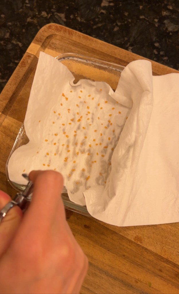 Step 3: Germinate. The best way I found to do this is to lay them on a paper towel, spritz with water until the whole paper towel is damp, and keep them in an air tight container.